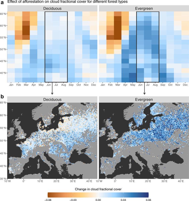 Cloud cover generally increased across the whole year over afforested areas in temperate, tropical and arid regions, sometimes by as much as 15%. But during boreal winter and spring across North America, Russia and Eastern Europe, when these regions have prolonged snow cover, the authors found a reduction in cloud cover over forests compared to open land. The boreal summer, on the other hand, has strong and consistent increases in cloud fraction by about 5%.