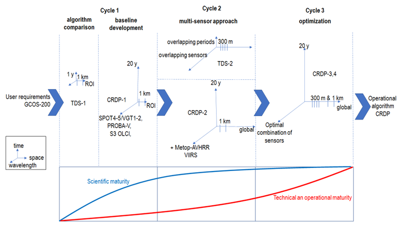 The figure below illustrates the general concept of the data sets produced during the three cycles of this project. It is organized with progressive inclusion of sensors, spatial and temporal coverage and resolution, with the dimensions of the test datasets (TDS) and climate research data packages (CRDP) illustrated. The initial emphasis is on the implementation of an innovative approach, gradually shifting towards selection and optimization for an operational context. The first cycle is distributed into an initial product validation and algorithm selection exercise, followed by the development of the baseline algorithm.