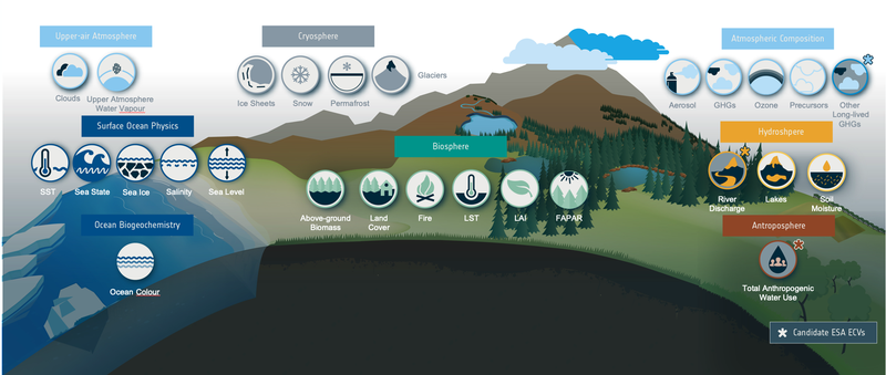 GCOS comprises expert panels which define a total of 55 which Essential Climate Variables needed to understand the climate system. Data for these ECVs helps to support the UNFCCC, with satellites providing observations for around two-thirds. Space-based Earth observation is singled out in the plan for its important contribution to monitoring many key aspects of climate.