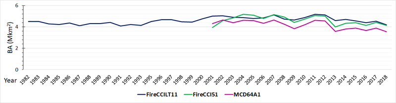 Burned area (Mkm2) 1982-2018 showing the FireCCILT11 (based on AVHRR-LTDR data) alongside FireCCI51 and MCD64A1