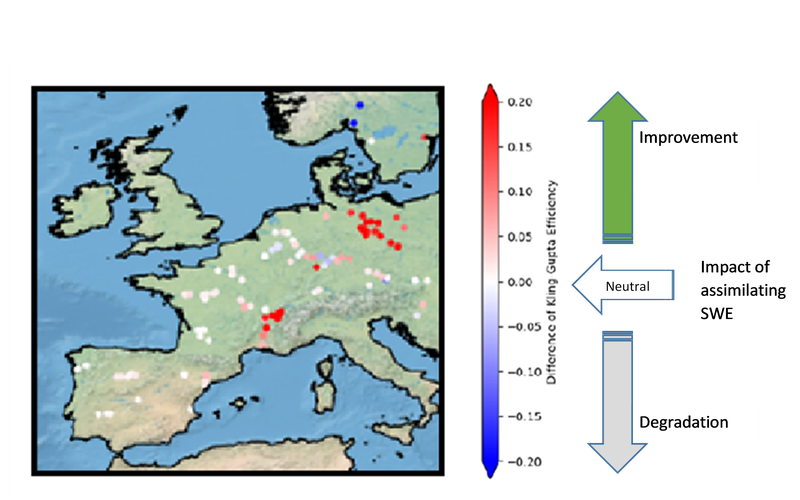 Figure 1: Impact on river discharge in Western Europe of assimilating SWE, using differences in the Kling-Gupta Efficiency verification metric (Gupta et al., 2009). The Rhône and Elba river basins are particularly improved (clusters of red dots).