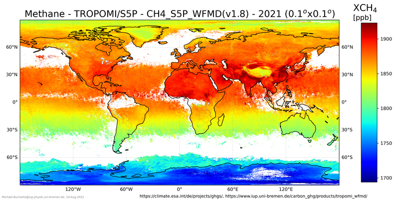 Atmospheric methane 2021 retrieved from TROPOMI/Sentinel-5-Precursor using the WFMD retrieval algorithm developed at University of Bremen (Schneising et al., 2022). Access to data and documentation.