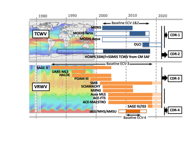 Figure 1: Key deliverables: The climate data records derived from a range of instruments include both total column (TCWV) and vertically resolved (VRes WV) information on water vapour.